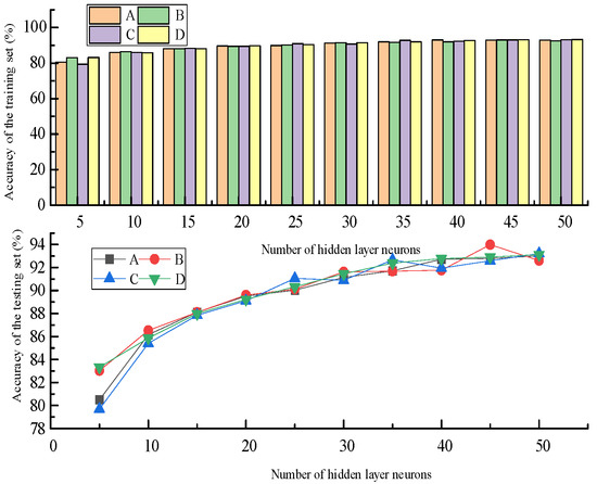 A bar graph represents the training set’s accuracy, and a line graph reflects the test set’s accuracy. At this point, the relationship between the accuracy (%) of its training set and the hidden layer neuron number of the neural network varies, as shown in Figure 19, below.