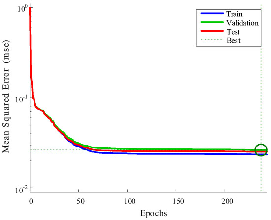 It can be seen from Figure 20 that with an increasing number of iterations, the mean square error of the training set gradually decreases. At 237 iterations, the mean square error is the smallest. Therefore, in this prediction mode, the number of hidden layer neurons and iterations is 40 and 300, respectively.