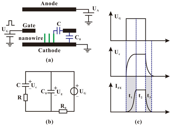 So far, the temporal responses of several kinds of quasi-one-dimensional field emitters have been reported. It is found that the response time of CNT can be down to ~100 ns [19,20], while that for individual SiC nanowire is ~1 ms [21]. For ZnO nanowire, the response time is tens of microseconds in a MOSFET controlled device [22]. Here, it should be noted that the plasma-induced electron emission [23,24,25] is not considered since it requires a pulsed voltage of more than 104 V, which is difficult to apply in a gated structure. This large difference in response time from different materials is related to the charging process under the pulsed driving voltage. Basically, in a gated field emitter device, as shown in Figure 1a, there are two charging processes. One is due to the capacitance C0 between gate and cathode electrodes that induces a delay for the actual voltage on the gate Ug. The other is due to the capacitance C between gate and emitter that induces a delay for the actual voltage difference Uc. The equivalent circuit can be seen schematically in Figure 1b, where R and R0 are the resistance of the emitter and electrode, respectively. Compared to CNT, SiC and ZnO nanowire have higher resistance due to their wide-bandgap semiconductor properties (for SiC nanowire, its piezoresistive effect further increases its resistance [21]), resulting in a longer delay for Uc as well as the field emission current IFE (note that the time for turning on and off IFE, as denoted by t1 and t3 in Figure 1c, is the response time). Therefore, to improve the response speed of a gated ZnO nanowire field emitter, one needs to reduce its nanowire resistance, which can be realized by tunning the resistivity or geometrical structure of the nanowire.