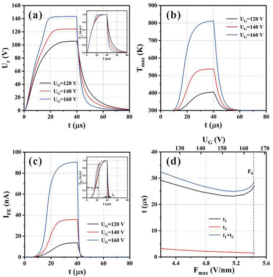 In the actual application, such as the application of the flat-panel X-ray source, the gated ZnO nanowire field emitter may need to work under continuous pulses. To investigate the influence of the self-heating effect in this case, its temporal response under continuous pulses with different UG is also simulated, for which the result with a pulse frequency of 25 kHz and UG of 164 V is shown in Figure 4. To maximize the duty ratio, we set the time for the off state (UG = 0 V) to be t3, which has been calculated from the single pulse case. Figure 4a shows the UG, Ug, and Uc versus t characteristics. It is clearly seen that under such a short time for the off state, both Ug and Uc cannot decrease to zero. However, for IFE, as shown in Figure 4c, it can be reduced to 10% of its maximum, which means that the device can be turned off. The underlying mechanism is due to the exponential relationship between IFE and Uc. From Figure 4c, the total response time t1 + t3 can be extracted as ~17.3 μs, which is shorter than that in the single pulse case (~27.4 μs) under the same UG with a pulse width of 40 μs. This is because during the short time of the off state, Tmax cannot cool down to room temperature, as shown in Figure 4b. As a result, R can remain at a lower value during the continuous pulses, which reduces the delay for Uc as well as IFE. Considering that the period of the pulses is 40 μs, t2 is ~22.7 μs, and the duty ratio for IFE can be calculated as ~57%, which is much smaller than that for the applied UG (~96%).