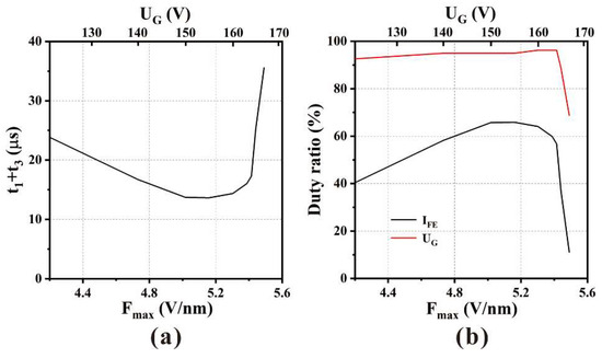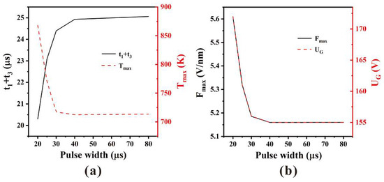 The effect of pulse width on the minimum response time t1 + t3 and the corresponding UG as well as the maximum Tmax and Fmax during the pulse is presented in Figure 3, where Figure 3a is the result for t1 + t3 and Tmax; Figure 3b is the result for UG and Fmax. It is seen that when the pulse width is long enough for IFE to reach its steady state (larger than ~40 μs in our case), the minimum t1 + t3 as well as the optimal Tmax, UG, and Fmax are independent in terms of pulse widths, which are ~25 μs, ~710 K, 155 V, and ~5.16 V/nm, respectively. However, when the pulse width is below ~40 μs, the minimum t1 + t3 will reduce, and the optimal Tmax, UG, and Fmax will increase as the pulse width decreases. This is because when the pulse width is too short, IFE keeps increasing during the whole pulse. As mentioned above, IFE has a slower increasing rate at the beginning and end during its rising process. To minimize t1, the increasing rate for IFE at the end of the pulse needs to be as slow as possible (in other words, the operation time t2, which is equal to the time for IFE to increase from 90% of its maximum to the end of the pulse, needs to be as long as possible), which needs a larger UG as well as Fmax to reduce the delay for Uc. As a result, Tmax will also increase. It is worth pointing out that although a shorter pulse width induces a shorter response time, the operation time t2 will also reduce to nearly zero. Furthermore, when the pulse width is too short, Ug does not have enough time to rise to the applied UG. Therefore, this abnormal operation situation is not under consideration in the following section.