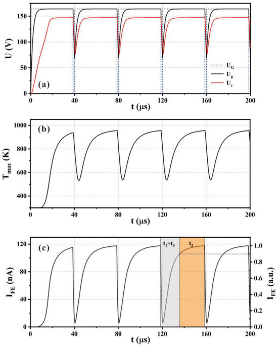 Simulated temporal response of the gated ZnO nanowire field emitter under continuous pulses with frequency of 25 kHz and UG of 164 V. (a) UG, Ug, and Uc versus t characteristics. (b) Tmax versus t characteristics. (c) IFE versus t characteristics.