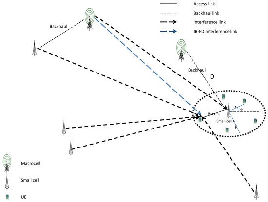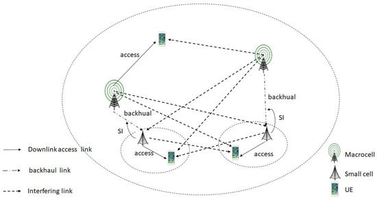 In OB-FDD networks, wireless resources allocated to links between the macrocell and small cells are orthogonal to those allocated for the data exchange between the small cell and its associated UEs, as shown in Figure 2. On the other hand, in IB-FD networks, small cells are able to carry out self-interference cancellation. Therefore, IF-FD is able to transmit and receive signals in the same time–frequency resource, as shown in Figure 3. For the IB-FD system model, we can see that there are two types of interference: (1) the self-interference(SI) at the small cells and (2) the backhaul interference to the UEs. It is noted that due to internal buffering and processing delay of the SBS receiver circuitry, the transmitted signal (i.e., signal from small cells to UEs) and received signal (i.e., the signal from macrocells to small cells) may not necessarily be the same. In that case, the interference from the small cells to the backhaul link can be removed [18].