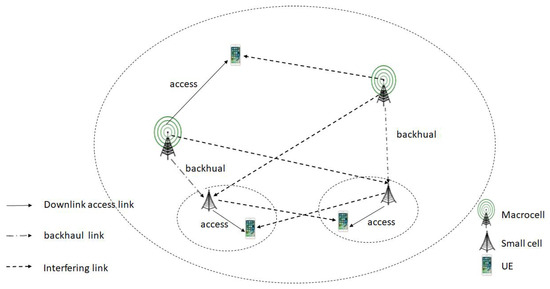 In [4], the authors proposed three strategies of a small-cell in-band wireless backhaul in massive MIMO systems to achieve throughput increase. However, they do not consider the intercell interference; moreover, the original backhaul capacity and the influence of user density on the macrocell performance are not mentioned in the paper. In [5], the authors maximize network energy efficiency by allocating both the transmission power of each small-cell base station to users and bandwidth for backhauling. In [6], the cell-planning problem for a two-tier network containing the BSs with a fiber backhaul and BSs with a wireless backhaul is investigated. The authors propose an algorithm to determine the minimum number of wired-BS and wireless-BS to satisfy the given cell and capacity coverage constraints. In [7], considering ultra-dense small-cell networks with optical and wireless backhaul, the authors design an energy-efficient backhauling strategy and propose a heuristic solution to solve the problem. In [8], the authors maximize the sum rate of a self-backhauled full-duplex dense, small-cell network under quality-of-service requirements and backhaul capacity constraints. In [9], a power-efficient full-duplex self-backhauling scheme for small cells of cellular networks is proposed, and the authors jointly optimize the backhaul link TX powers for multiple small cells while maintaining the same UE capacity. All the aforementioned works focus on the optimization of network performance with the wireless backhaul. In [10,11,12], the network capacity performance with a wireless backhaul was evaluated analytically. In [10], the authors analyze the self-backhauling in as band full duplex HetNets architecture using a stochastic geometry-based model. However, the authors do not consider the original backhaul capacity. In [11], the authors provide a minimum average hop number algorithm to optimize the network capacity and energy efficiency. In [12], the upper bound of the network capacity with wireless backhaul is evaluated based on the number of antennas per BS. In [13], with the tool of stochastic geometry, the authors examine the performance of mMTC in an ultra-dense network (UDN) environment that utilizes the mmWave band and employs wireless backhaul support for the small cell. In [14], the authors propose a load-balancing algorithm for small-cell-integrated access and backhaul networks operating in the millimeter wave (mmWave) band. The simulation results show that the proposed algorithm not only distributes the load across small cells more evenly but also increases network capacity. In [15], the authors jointly optimize the user association and backhaul resource allocation in mmWave HetNets, and a multi-agent deep reinforcement-learning-based scheme is proposed to maximize the long-term total link throughput of the network. In [16], the authors propose a multi-agent distributed Q-learning algorithm with pre-resource partitioning to solve the problem of channel allocation and energy consumption of integrated access and backhaul networks. In [17], the authors jointly optimize transmission precoding and rate allocation to maximize the spectral efficiency in rate-splitting multiple access HetNets.