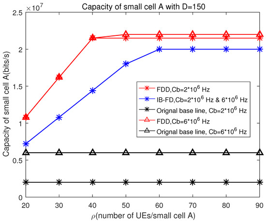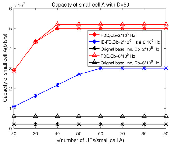 Figure 4 and Figure 5 can be obtained from the optimization of (16). Both figures illustrate the capacity of small cell A with the OB-FDD and IB-FD methods. It can be seen that the OB-FDD method outperforms the IB-FD method significantly, which is for two reasons: (1) With the IB-FD method, the spectrum efficiency of UEs’ data links and wireless backhaul links degrade on a large scale due to the cross-tier interference. (2) For the OB-FDD method, the whole spectrum can be utilized to communicate with small cell A (), especially when the UE density is low, which means enough bandwidth can be allocated to small cell A as its wireless backhaul link to serve its traffic. Furthermore, it is obvious to see that both OB-FDD and IB-FD achieve much better performance than the original baseline. In addition, the enhancement of the wireless backhaul falls with the increase in D.