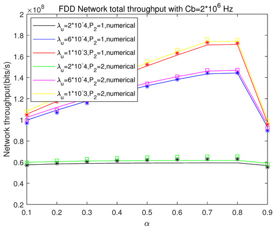 Figure 8 illustrates the relationship between the IB-FD network throughput and the different UE density. From Figure 8, it is obvious that the network throughput increases with the rise in . Moreover, it is easy to see that the network throughput has a limitation. There are some inconsistencies among the theoretical and simulation results in Figure 8, especially for increased UE density. The main reason is that the Laplace transform of interference from small cells and macrocells has a slight difference with simulation ones for the IBFD approach.