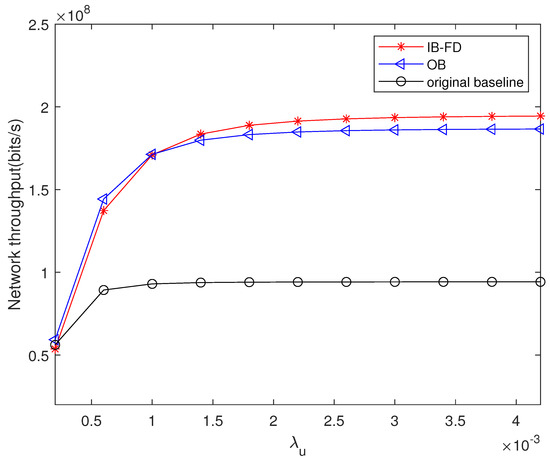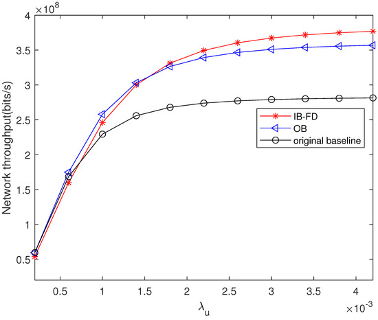 Figure 9 and Figure 10 compare the network throughput performance of IB-FD and OB-FDD when and . It can be seen that the IB-FD approach outperforms OB-FDD, especially with a higher UE density (>), which is because for the IB-FD approach, UEs have a relatively higher data rate because more bandwidth will be allocated to UEs for transmission with the IB-FD approach. Moreover, both OB-FDD and IB-FD have a significant improvement to the original base, especially with a small .