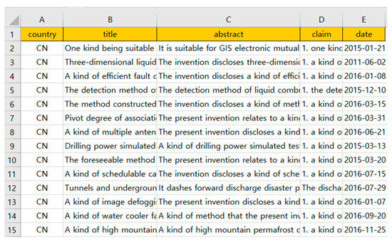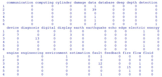 In this experiment, we selected the title and abstract from the patent data in Figure 10 for keyword data analysis. Using text mining techniques, we constructed the document–keyword matrix from the valid patent documents, as shown in Figure 11.