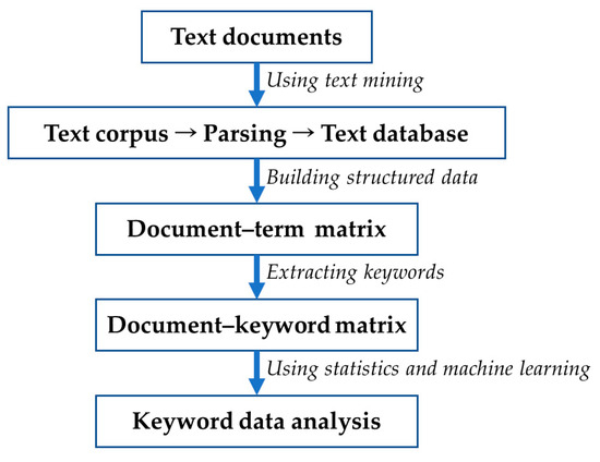Much big data is in text form. Therefore, we have to extract the keywords from text data and analyze them by methods such as constructing document–keyword matrices, N-grams and correlation analysis between keywords, sentiment analysis, topic modeling, etc. [4,5]. The first task to be performed in keyword data analysis is to collect text documents on a given topic. As explained in Figure 2, the collected document data are preprocessed using text mining and natural language processing techniques. The preprocessed text document data set has a frequency matrix structure in which the rows and columns are documents and terms, respectively, as shown in Figure 1. This matrix is called the document–term matrix [5]. Next, we extract the keywords from the document–term matrix and construct the document–keyword matrix, as shown in Table 1.