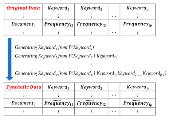 In Figure 4, we fit statistical models of the keywords to the original data and generate synthetic data that is completely new data of the keywords. We denote original and synthetic data as and . Using the original data, we find the joint probability distribution of keywords. We represent the probability distribution of as Equation (3).