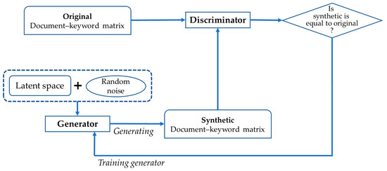 where and represent the generator and discriminator respectively. and are input data and random noise, which follow a normal distribution. In Equation (4), also is the latent representation of . and are the generative and latent models. The discriminator wants to maximize , and on the other side, the generator tries to minimize . In this paper, the document–keyword matrix is used as in Equation (4). Figure 5 illustrates the process of generating a synthetic document–keyword matrix using GAN.