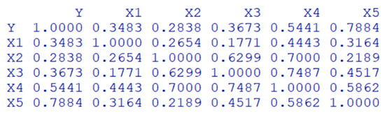 In keyword data analysis, each element of a document–keyword matrix is the frequency value of keyword occurring in document. This count data follows a Poisson distribution [7,38]. Thus, we generated the random numbers from the multivariate generalized Poisson distribution [39,40]. We used the R data language and R package for generating simulation data and data analysis [32,40]. For our simulation data for keyword data analysis, we considered the mixture of Poisson distributions with two parameters, rate and dispersion [39,40,41]. In our simulation study, we consider a linear model with six variables (keywords), as shown in Equation (8).