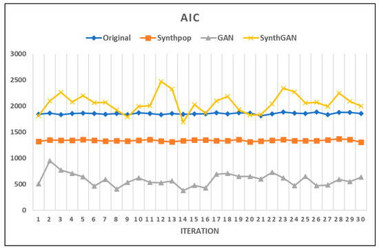 In Table 3, We built the linear model in Equation (7) for the four data sets and calculated the AIC value for each model. The elements of original data are count data because they were generated from a generalized Poisson distribution. The synthetic data generated by synthpop from the original data are also count data because they are created by a joint distribution of frequency count data. However, the synthetic data set created by GAN is a continuous data type because the generator of GAN creates the new data from the latent space of a normal distribution and random noise. In this paper, it is possible to use continuous data because the constructed linear model of keywords allows such data. Lastly, we combined the synthetic data sets from synthpop and GAN (SynthGAN). Figure 8 is a visualization of the AIC values in Table 3.