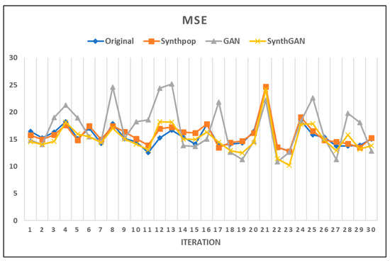 By comparing the MSE values of the models, we can check the prediction performance between the compared models. We confirmed in Table 4 that the difference in MSE values for the compared models was not large. Figure 9 shows the MSE plot of compared models with the original and synthetic data sets.