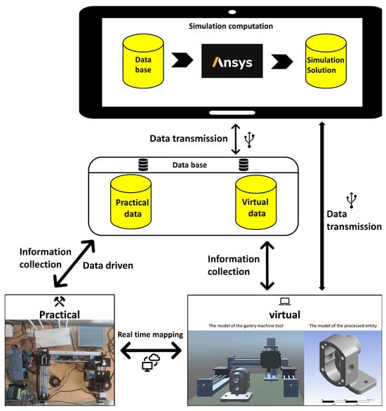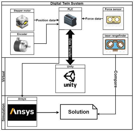 This paper presents a prototype designed to assess the feasibility and applicability of the proposed technical solution. Our developed DT system consists of three fundamental components: the design of the physical twin (i.e., the hardware milling station), the virtual twin (the virtual model of the milling station), and the FEM-based computer simulation module for obtaining real-time variation of stress and strain. The framework of the whole system is shown in Figure 1.