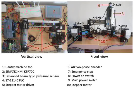 For the control system, the Siemens Programmable Logic Controller (PLC), version S7-1214C, was used to control the axis motion and machining process. The Siemens S7-1200 is a compact PLC which is widely applied in small- and medium-scale industrial automated systems, and is particularly suitable in most basic control applications, such as controlling the motion sequence for machines such as gantry machine tools, Cartesian robot arms, etc. [,]. The compact design of S7-1200 can effectively minimize spatial requirements and enhance adaptability across diverse applications. It can manage complicated control tasks, thus achieving efficient automation and precision in control processes. A special feature of S7-1200 is due to its wide choices of communication interfaces, with Ethernet protocols such as TCP/IP and PROFINET, series protocols like RS422 and RS485, and even wireless communications. This diversity allows integration into the relevant control system of various devices and systems, thus enabling a comprehensive networking infrastructure and seamless data exchange. As compared with other models of PLCs, the S7-1200 is not only compact and versatile (over, e.g., Mitsubishi, FX3U series), but is also much less expensive (over SIEMENS S7-1500), which renders it ideal for small/medium-scale applications like that of our study. Further, a PLC is apparently more powerful than microcomputers, e.g., Raspberry Pi and Arduino, in the context of CPU capability, driving power of I/OS, etc. As we always retain the possibility of expanding our facility by integrating with more industrial devices, e.g., pneumatic and electromagnetic actuators, electromagnetic valves, and relays, as well as industrial sensors, all of which are unable to be driven by Raspberry Pi and/or Arduino, a PLC is, thus, preferred. To obtain motion parameters of each axis, i.e., the actual angular displacement and speed of respective stepper motors, rotary incremental encoders are mounted with the stepper motors of each axis. The encoders feed back the measurements to PLC through digital input terminals of the PLC. To obtain real-time applied milling force imposed on the workpiece, a balanced beam pressure sensor is used, which feeds back its measurements to the PLC through a communication terminal applying MODBUS RTU protocol. To measure the real-time strain variation, characterizing the deformation of the milling surface, a laser rangefinder (BLG-50) is used.