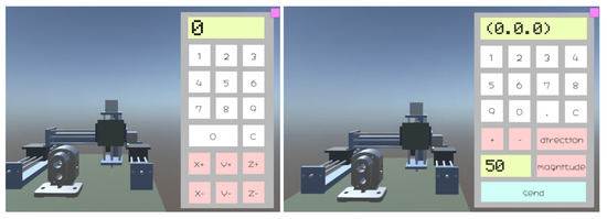 Data from the UI panel, related to the virtual control of the physical system, is written to another pre-established offset address, and Figure 7 and Algorithm 1 show the UI panel design and pseudocode, respectively. These data include the user’s desired speed and direction for the machine’s movement. They are transmitted directly to the PLC’s motion control module, enabling the control of the machine’s movement through the PLC’s control panel, thereby achieving real control over the gantry machine tool. Furthermore, after switching the panel, it is possible to transfer “data regarding the direction and magnitude of force” to another offset address in the PLC. These data will be read and transmitted to ANSYS using Snap7 by a Python script, and, finally, ANSYS will complete the calculations. The data connectivity diagram is shown in Figure 8.