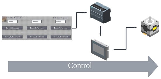 We used the Siemens HMI, model KTP700, which is directly compatible with the Siemens PLC. The control interface is shown in Figure 10 and enables manual control mode as well as automatic control with specified linear displacement for each axis. Data communication between HMI and PLC is achieved through ProfiNet, i.e., the Siemens-provided standard protocol that is highly efficient.