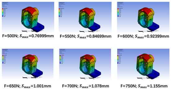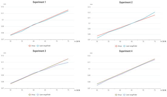 In practical scenarios, industrial loads may extend into the magnitudes of thousands, or even tens of thousands, of Newtons. However, constrained by experimental conditions, we deliberately confined our investigation to the range of applied loads between 500 N and 750 N, increasing in 50 N increments. With finite element analysis, we can obtain the deformation, S, generated by the processed entity in the current situation which is under different loads, F, as shown in Figure 15. At the same time, the deformation data measured by the laser rangefinder are obtained to compare with deformation S, so that the study can assess the accuracy of our FEM simulation through such comparison, shown in Figure 16. Following the execution of finite element analysis, the maximum deformation of the subject entity was ascertained under six distinct loads. Subsequently, a laser rangefinder was deployed to gauge the displacement data of the central point within the red area in the post-deformation rendering, capturing the deformation value of the entity under these six varied loads. Notably, four measurements were conducted for each specific load magnitude. The ensuing line chart delineates a comparative analysis between the physical deformation data derived from ANSYS through four measurements and the deformation data acquired via a laser measuring instrument.