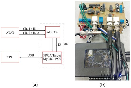 Block diagram of the experimental board (a) and picture of the data acquisition system (b) comprising two stacked circuit boards (logic above and power below) and myRIO-1900 device with Xilinx Zynq-7010 processor (LabVIEW RT) and FPGA.