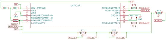 The complete electrical schematic of the expanded analog filter circuit ADF339 is presented in Figure 2, Figure 3, Figure 4 and Figure 5. The programmable analog filter circuit was designed in two parts due to the concept of constructing the system with two PCB boards connected by wires. The power supply circuit consists of a transformer, rectifier diodes, capacitors, and regulators to achieve symmetrical and V power. The electronics design follows the well-known standard scheme, e.g., that given in [].