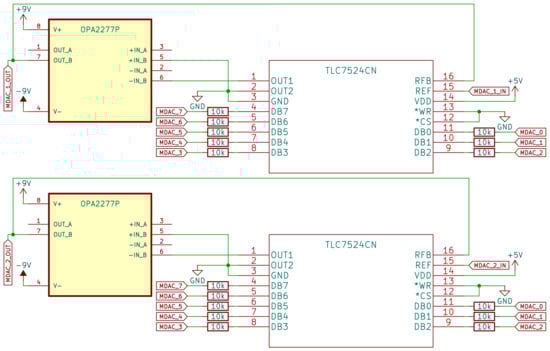 The first modification introduced to the model of programmable analog filter circuit proposed by TI involved replacing the no longer available digital-to-analog converters DAC7541A with devices of similar characteristics, namely TLC7524. Operational amplifiers were substituted with the OPA2277PA model. In the model of a programmable filter, four outputs for specific filter types were envisaged: low-pass, high-pass, band-pass, and band stop. To eliminate switching using a switch, an output selector was implemented using three relays; see Figure 6 (left-hand side).