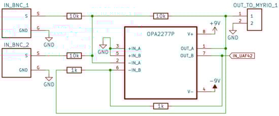 The circuit in Figure 4 depicts a summing of signals from two analog inputs: ’IN BNC 1’ and ’IN BNC 2’. Subsequently, this signal is inverted using the second channel of the OPA2277P amplifier.