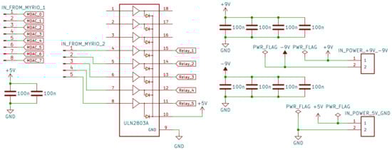 The circuit diagram shown in Figure 5 illustrates various connectors, including power supply terminals and V, as well as GND, sockets to the myRIO system, and the ULN2803 Darlington driver circuit for controlling relay coils. The power supply unit, implemented using a transformer and voltage regulators (L7805CV, L7809CV, and L7909CV), is not depicted due to its standard implementation, which has been omitted in this work. Additionally, the schematic incorporates voltage filtering capacitors strategically placed near operational amplifier circuits MADC and UAF42P.