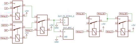The benefits of using relays instead of ordinary switches include the following: (a) the ability to select the filter output from the LabVIEW program; (b) the possibility of programming in such a way as to enable automatic data acquisition responses for each type of implemented filter; (c) when comparing analog and digital filters, using relays allows for the simultaneous selection of both an analog and a digital filter from a single variable in the LabVIEW program, which is faster and eliminates the potential error of selecting a different type of analog filter than digital and comparing responses.