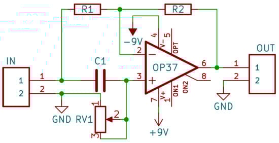 A phase shifter based on the high-precision, low-noise OP37 operational amplifier powered by a symmetrical voltage of ±9 V is employed for the analog signal filtering. The phase shifter, shown in Figure 7, refers to a circuit designed to alter the phase relationship between the input and output analog signals.