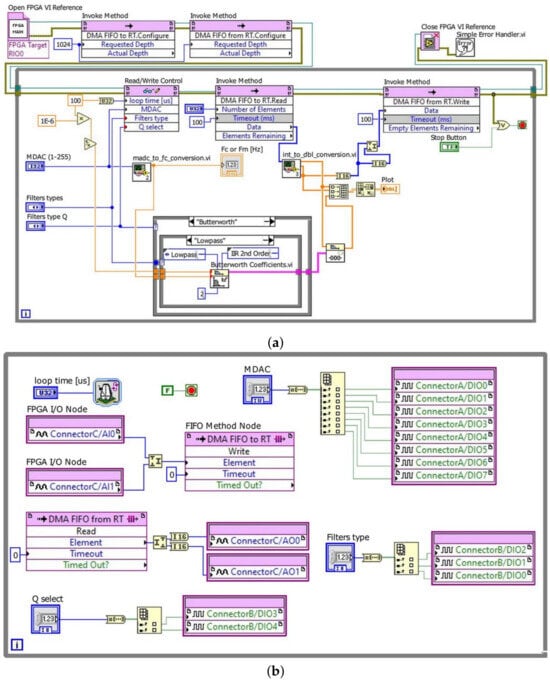 (a) A virtual instrument RTMain in LabVIEW establishing transmission between the RT system and the FPGA array. (b) A virtual instrument FPGAMain in LabVIEW receiving information about the selected cutoff frequency and then transferring it to an 8-bit data bus output, which controls MDAC units. Implementation of the numerical programming in diagrams of virtual instruments in LabVIEW allowing for receiving the analog signals from input ports of ADF339, realization of digital filtering, and sending the digital data to control settings of the analog signals.