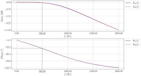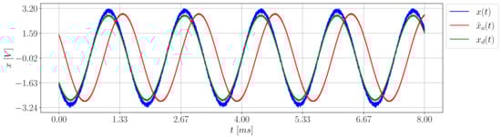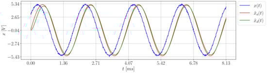 In Figure 12, the effect of applying a low-pass filter with a phase shifter is demonstrated (see the electronic circuit in Figure 7). The obtained correct shift in the response indicates a good effectiveness of the filtration within the frequency range of the investigated system’s operation. The filtration was performed using a Butterworth topology with a cutoff frequency set at Hz.