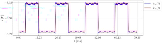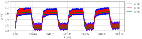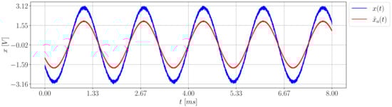 The filtration process effectively reduced the impact of noise in the signals and , thus leading to a much higher pSNR. In practical terms, the higher pSNR values suggest that the observed signals are more distinguishable from the background noise, and this improvement will be beneficial in the presented applications, where a clear and reliable signal is desired. Exceptionally, the second case and lower pSNR values of the signal need the digital approach, in which has been achieved; see the waveform in Figure 15. The results of this test indicate a limitation in the minimum cutoff frequency available on the examined board.