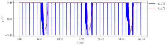 The third signal originated from the third laboratory setup used to investigate the phenomenon of magnetic levitation. In Figure 13c, a coil with a metal core served as the source of a magnetic field interacting with an object stably levitating in space. In the electronic control system, a magnetic field sensor measured the field’s intensity and transmitted it to a PID controller. Through a power circuit, the PID controller adjusts the coil current by modulating the PWM signal duty cycle, which is measured at a high resistive load. It turns out, as commonly encountered in switching systems, that the electronic circuit generating the PWM signal exhibited high-frequency switching that interfered with the regulation. This impact affected the quality of stabilizing the levitating object in a dynamically balanced position. The effect of filtering this signal using the tested ADF339 is shown in Figure 16.
