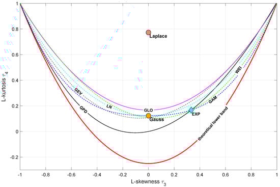 L-moments have been introduced by Hosking []. The LMRDs are popular in the extreme analysis. They allow the identification of proper distribution for empirical observations. The LMRD() is the most common and it shows the L-kurtosis versus L-skewness . Similarly to MRDs, one can confront the empirical data with the theoretical PDF candidate []. A blank diagram with shapes (points or curves) for some theoretical PDFs is presented in Figure 1.