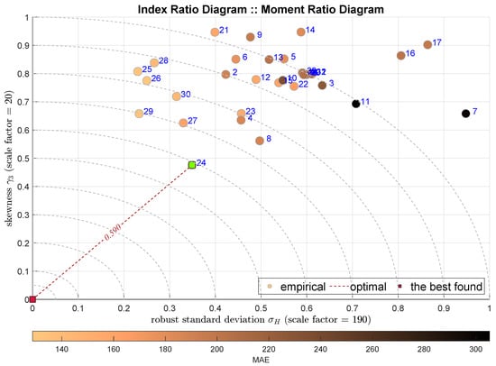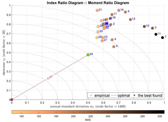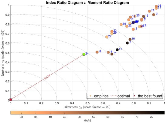 Moment ratio diagrams graphically show the statistical properties of the considered time series in a plane. The MRD is a graphical representation in Cartesian coordinates of a pair of standardized moments. Actually, there are two versions []. The MRD() shows the third standardized moment (or its square ) as abscissa and the fourth moment as ordinate, plotted upside down. There exists a theoretical limitation of the accessible area, as . The locus corresponding to PDF can be a point, curve or region. It depends on the number of shape parameters. PDFs lacking shape factor (like Gauss or Laplace) are represented by a point, and functions with one shape coefficient are represented by a curve. Regions reflect functions with two shape factors. The second type of the diagram MRD() represents variance as the abscissa and skewness as the ordinate.