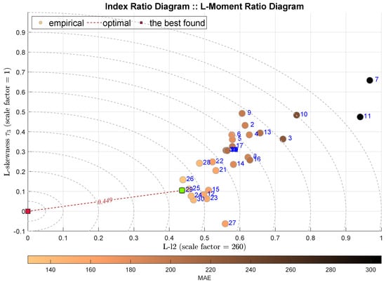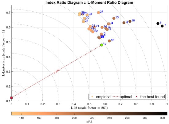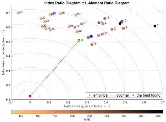 The L-moments deliver reliable estimates, especially for small samples and fat-tailed distributions. They form a backbone for the L-moments ratio diagrams, which support the distribution fitting to empirical samples. The most common diagram uses L-kurtosis () versus L-skewness () relationship []. Apart from that, L-moments diagrams are used to compare various samples originating from different sources in search for the homogeneity [,]. These features constitute the research idea for the proposal of the IRDs.