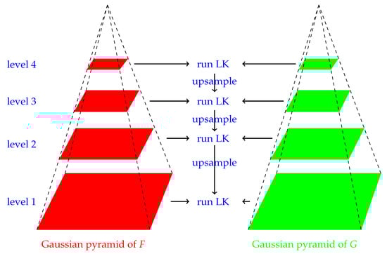 The pyramidal implementation is shown in Figure 1 for two images F and G that are taken at times t and respectively. The optical flow is computed at the top of the pyramid, level 4 (the coarsest image) in Figure 1, which is the initial condition for the computation of the optical flow at level 3 of the pyramid. It follows from (8) that (5) yields good estimates of u and v if the translation between the images at times t and is small. Only the increments between successive levels of the pyramid are therefore calculated, after warping the two images based on the flow field estimate from the coarse level. This operation yields two matrices, one for each component of the optical flow, and each matrix is upsampled to yield matrices of twice the number of rows and columns, and then passed through a modified form of the filter (9),