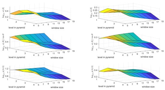 The mean and standard deviation of the angle θ, where is defined in (16), and the error , where e is defined in (11), are shown in Figure 4. It is seen that the mean of θ is approximately constant for windows of side length 7 pixels or more at levels 2, 3 and 4 of the pyramid. Figure 4 (left) shows that the variation of the means of θ and are very similar, but Figure 4 (right) show that, for each measure, the standard deviation is significant, which implies that there is considerable variation of each measure.
