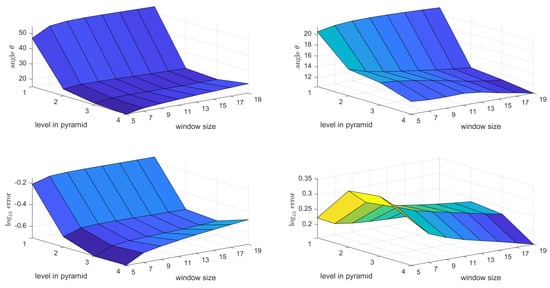 The variation of the mean (left) and standard deviation (right) of the angle and the error , with the size of the window and number of levels in the pyramid, for Example 2.