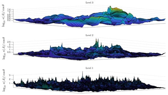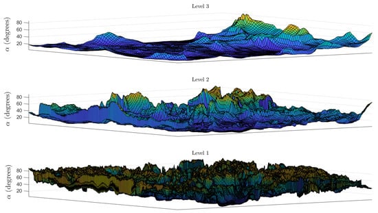 The method with a pyramid of three levels was applied to the images in Figure 2, with a window of size . The condition number , upper bound of the effective condition number, the non-linear condition number , angle θ and error were computed for every problem in the windows for each level of the pyramid. Figure 5 shows the axes and size of the image at each level of the pyramid for Figure 6, Figure 7, Figure 8, Figure 9 and Figure 10. These figures show that the quantities above increase, and the standard deviation of each of these quantities increases, as the pyramid is descended. The figures are therefore consistent with Figure 3 and Figure 4, and it follows that the computational reliability of the optical flow decreases as the pyramid is descended.
