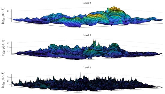 The condition number at level three (top), level two (middle) and level one (base) of the pyramid, for Example 3.