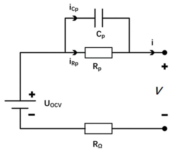 The equivalent circuit diagram of the first-order RC model is shown in Figure 1. RΩ is the ohmic internal resistance of the battery, Cp is the polarization capacitor, Rp is the polarization resistance, and RΩ, Cp, Rp, and other parameters are related to the battery SOC, temperature, aging degree, etc. For the battery equivalent circuit model, the battery terminal voltage expression can be obtained by Kirchhoff’s law: