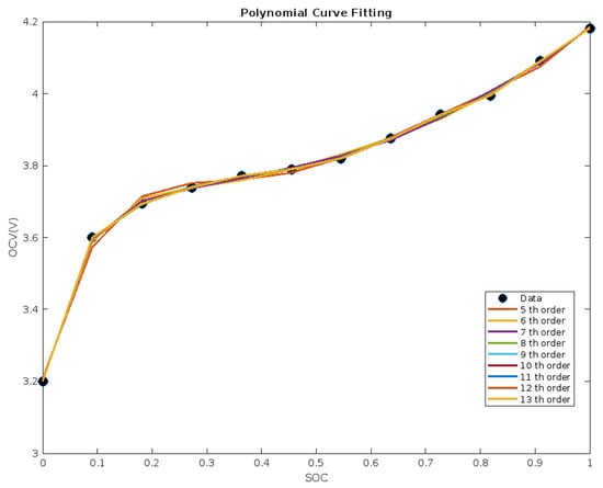 When the 13th order linear fitting was used, a better fitting effect was obtained, which was able to better represent the SOC-OCV relationship, and the fitted expression is as follows [32]:
