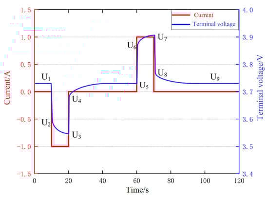 U1–U4 discharge pulse process in Figure 3 (duration 10 s): under the excitation of a 10 s discharge pulse, the terminal voltage of the battery falls rapidly from U1 to U2, which is due to the polarization phenomenon inside the battery, and because of the rapid fall time, the voltage drop from U1 to U2 is considered to be mainly caused by ohmic polarization. The U2–U3 stage, on the other hand, has a slower voltage drop, which is more similar to the changes corresponding to its electrochemical polarization and concentration polarization when the battery is continuously discharged, and therefore it is considered that this stage is the total effect of the two polarization effects. At the end of discharge, U3 rises to U4 with a very fast rate of increase, similar to the voltage drop caused by ohmic polarization during discharge, so it is considered that this stage is the effect of the disappearance of ohmic internal resistance. Since there will be errors in testing, which will have an impact on the calculation accuracy, the average value of the ohmic internal resistance of the two stages is chosen to calculate the battery’s ohmic internal resistance. The formula for calculating the battery ohmic internal resistance is shown in (7).