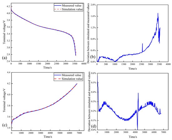 Experimental validation of battery simulation model. (a) Battery terminal voltage under constant current discharge condition, (b) deviation between simulated and experimental values under constant current charging condition, (c) battery terminal voltage under constant current charging condition, (d) deviation between simulated and experimental values under constant current charging condition.
