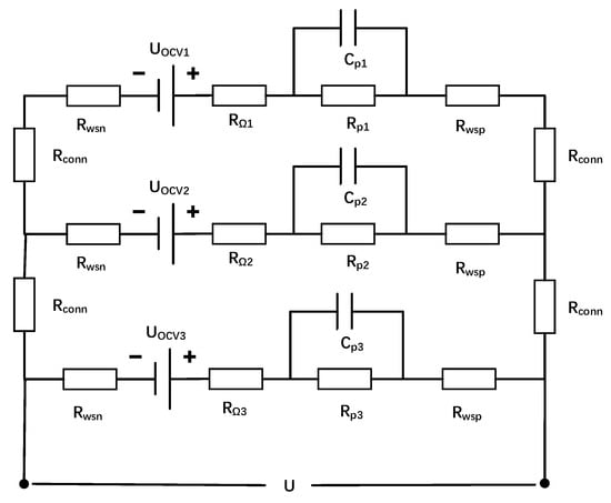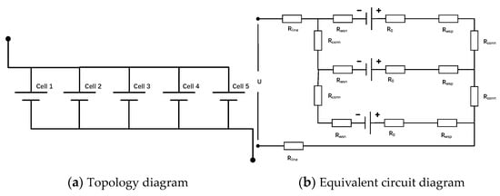Battery packs with parallel-connected lithium-ion battery cells are modeled for simulation. The equivalent circuit model is created by two parallel-connected cells as shown in Figure 5.