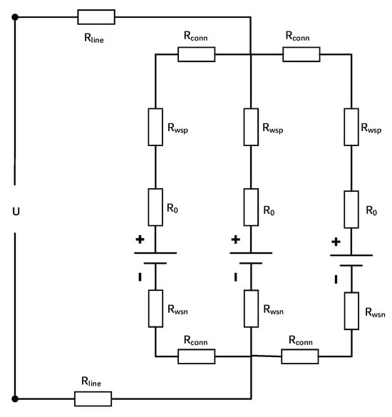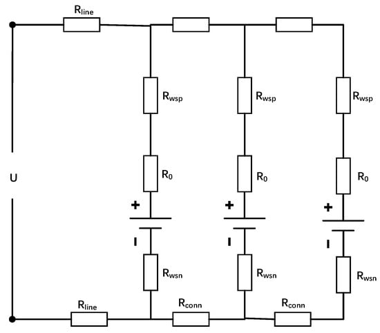 A commonly used parallel battery pack connection is connected to a battery monomer. Different connection methods have a certain impact on the consistency of the battery. Different connection methods lead to each single cell being connected to the total connecting piece of different resistance values, for the convenience of expression, set the ith single cell internal resistance for R0 and connecting line resistance for Rline. The actual simulation is still by the first-order RC model calculation. Then, the single-side connection circuit diagram of three single batteries connected in parallel is shown in Figure 7.