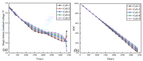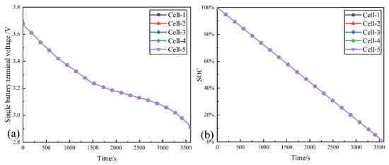 (a) Terminal voltage, (b) SOC. Simulation results of constant current discharge of each single cell with a single side connection structure.