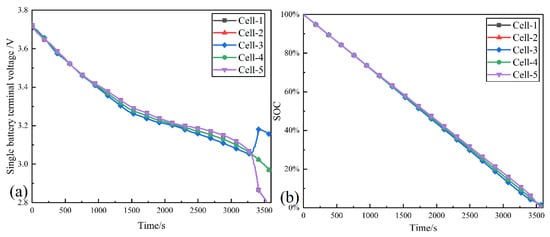 Comparing Figure 10a and Figure 11a, it can be seen that before the end of the discharge period, the farther away the current is from the battery pole post, the higher the terminal voltage of the single cell. The reason is that the farther away from the battery pole post, the higher the resistance of the connecting tabs, and the initial SOC is the same when the OCV is the same, the parallel voltage is the same, and the voltage drop caused by the resistance of the connecting tabs of each single cell in conjunction with the ohmic internal resistance is the same, and the higher the value of connecting tabs’ resistance is, the smaller the current is. At the end of discharge, combined with Figure 10b and Figure 11b, it can be seen that the circuit fluctuates because the SOC of the single cell close to the pole columns is the first to drop to a very low level, and the low SOC ohmic internal resistance and the polarization internal resistance increase sharply, and the current decreases.